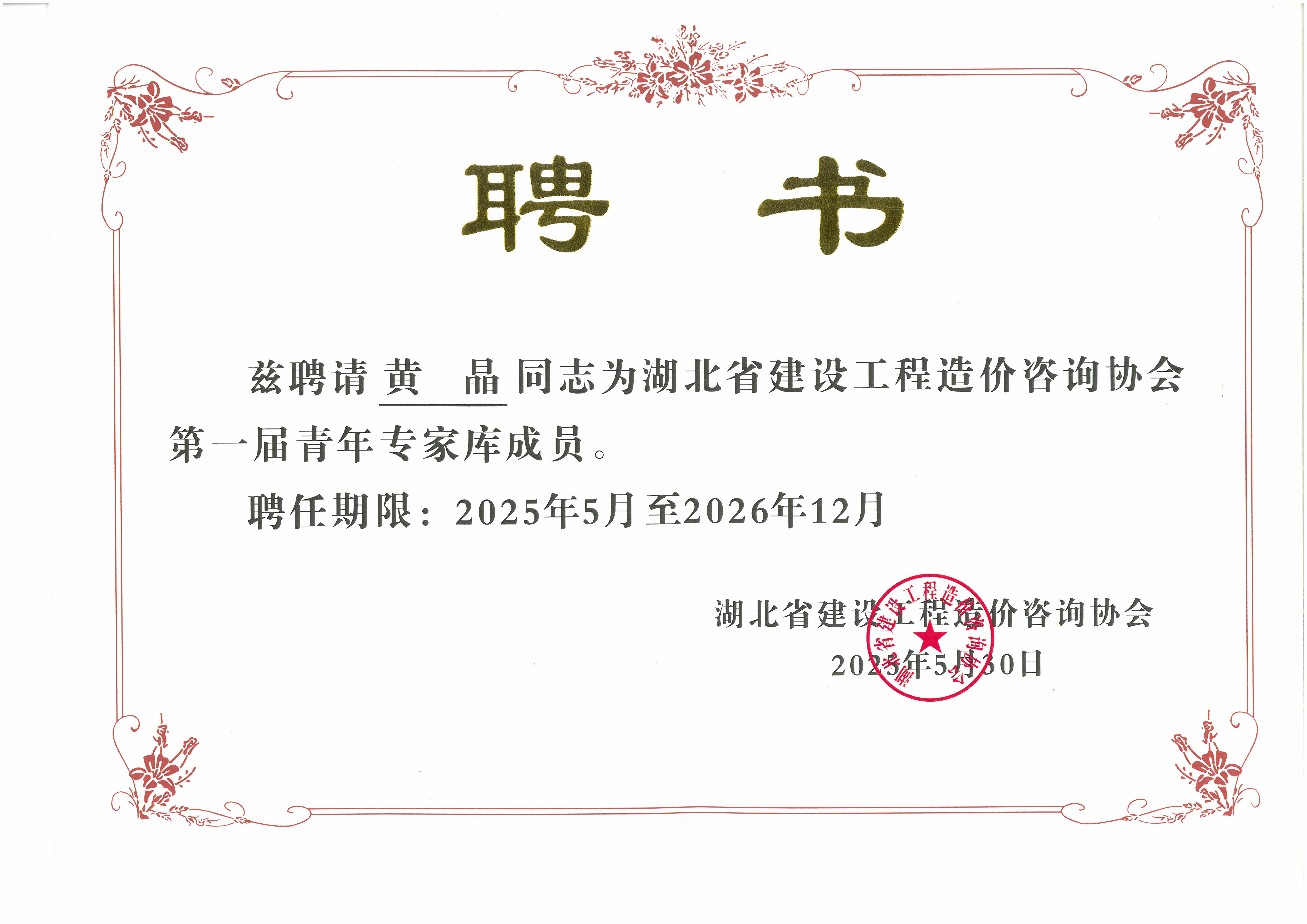 此次入選湖北省建設(shè)工程造價咨詢協(xié)會第一屆青年專家?guī)欤粌H是對黃晶個人專業(yè)能力的高度認(rèn)可,更是對我司在工程造價領(lǐng)域?qū)I(yè)水平的肯定。這既是一份榮譽,更是一份責(zé)任。
